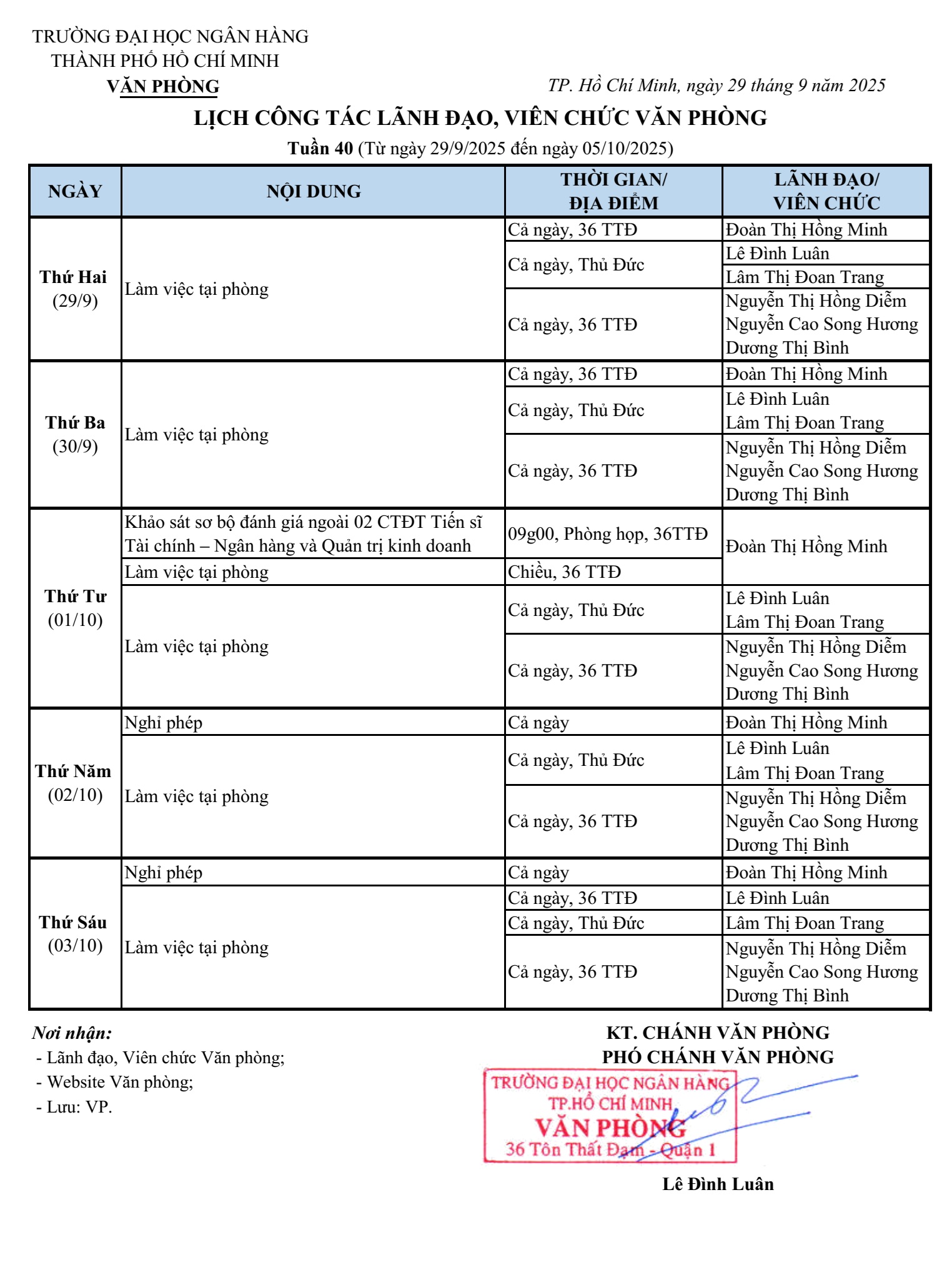 Lịch công tác Lãnh đạo, Viên chức Văn phòng tuần 40 năm 2025 (Từ ngày 29/9/2025 đến ngày 05/10/2025)