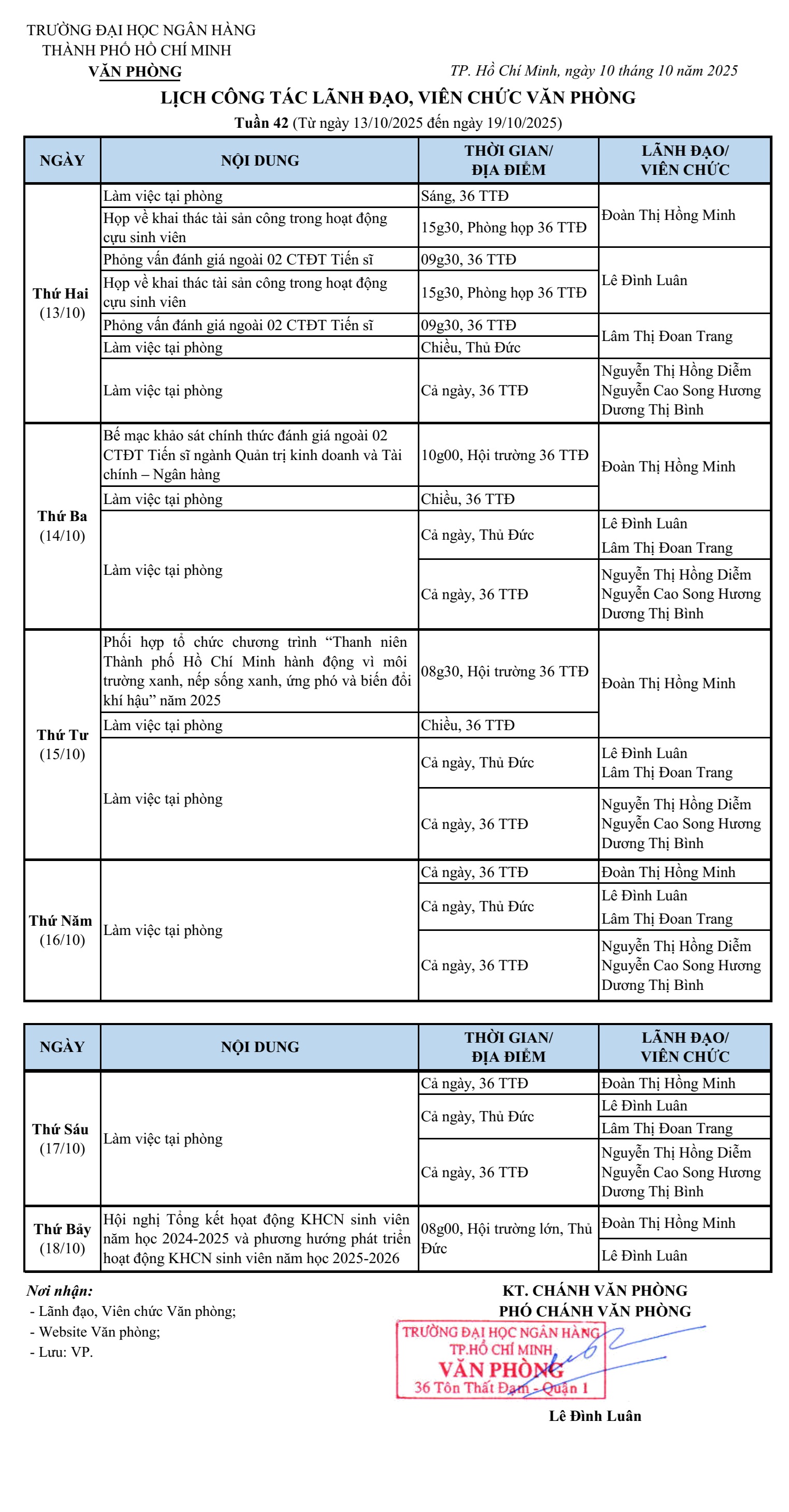 Lịch công tác Lãnh đạo, Viên chức Văn phòng tuần 42 năm 2025 (Từ ngày 13/10/2025 đến ngày 19/10/2025)