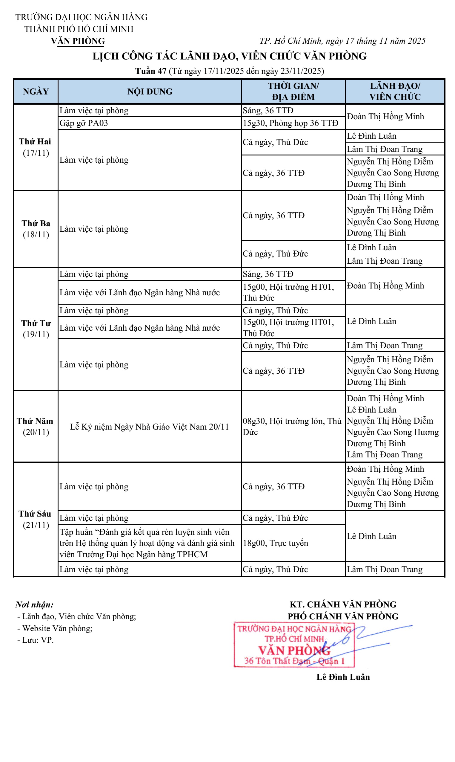 Lịch công tác Lãnh đạo, Viên chức Văn phòng tuần 47 năm 2025 (Từ ngày 17/11/2025 đến ngày 23/11/2025)