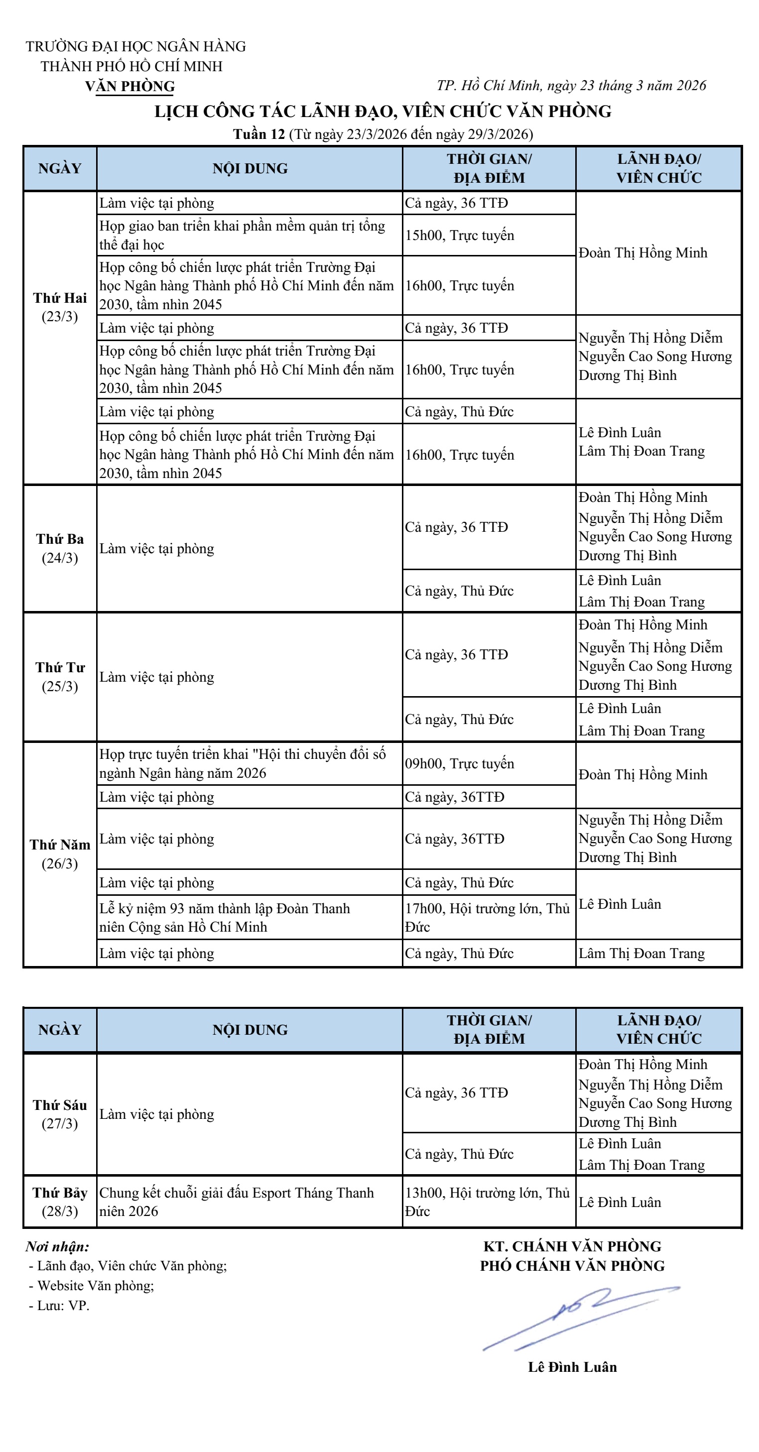 Lịch công tác Lãnh đạo, Viên chức Văn phòng tuần 12 năm 2026 (Từ ngày 23/3/2026 đến ngày 29/3/2026)